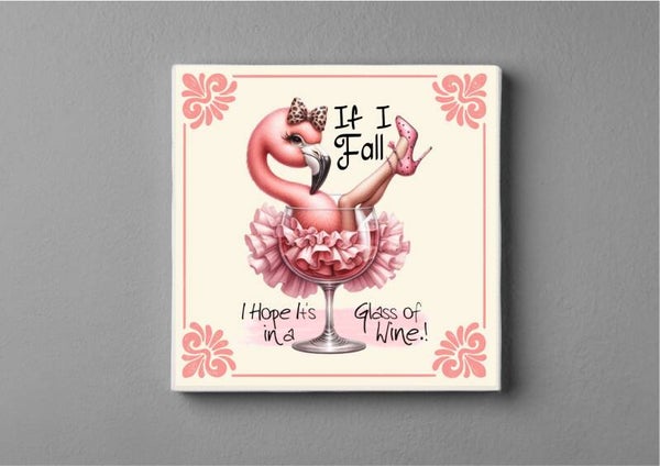 Op zoek naar een uniek en vrolijk cadeautje? Dit hilarische Delftsblauwe tegeltje met een stijlvolle flamingo in een glas wijn is een echte eyecatcher! Met de grappige tekst "If I fall, I hope it’s in a glass of wine!" tover je gegarandeerd een glimlach op elk gezicht.